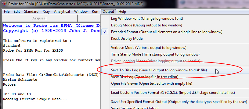 In fact, one can record the log window output during an entire probe run for complete documentation purposes using this option. In addition, one can add comments to the log window and they will be automatically saved to the .OUT file as seen here:
