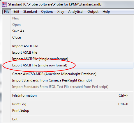 Note that you can list the standard compositions from the Standard or Probe for EPMA applications to the log window and then either copy and paste into a text document, or use the Output | Save To Disk Log menu to save subsequent log window output to a text file with a .OUT extension.