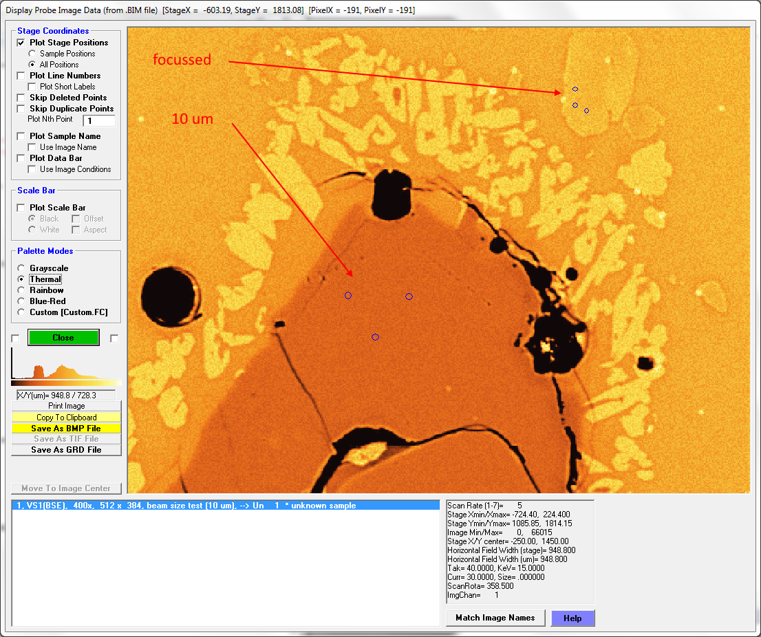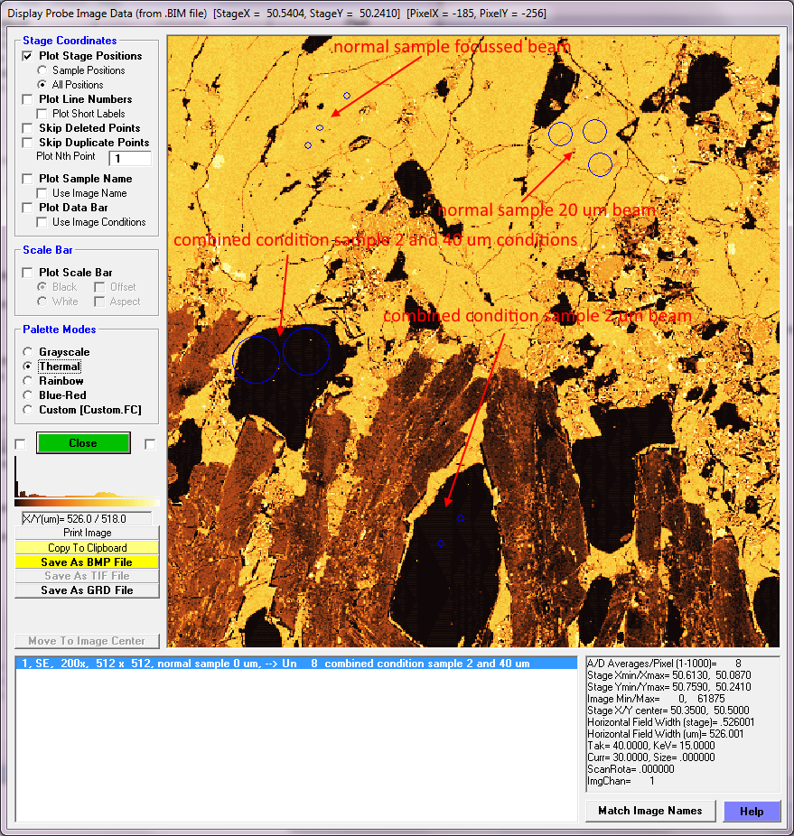 In Display, Annotate, and Export Analog Signal Images, when I say Plot Stage Positions and select Sample Positions, it's working fine. It shows small circles for a normal 0 µm beam spot measurement.