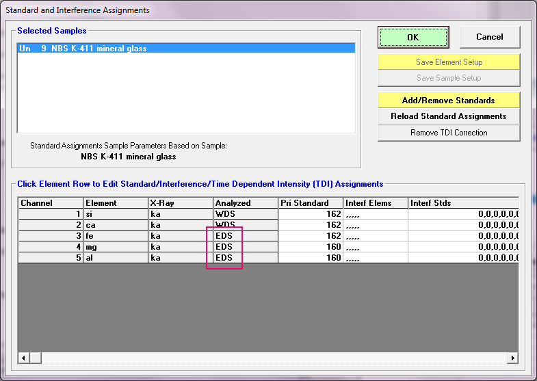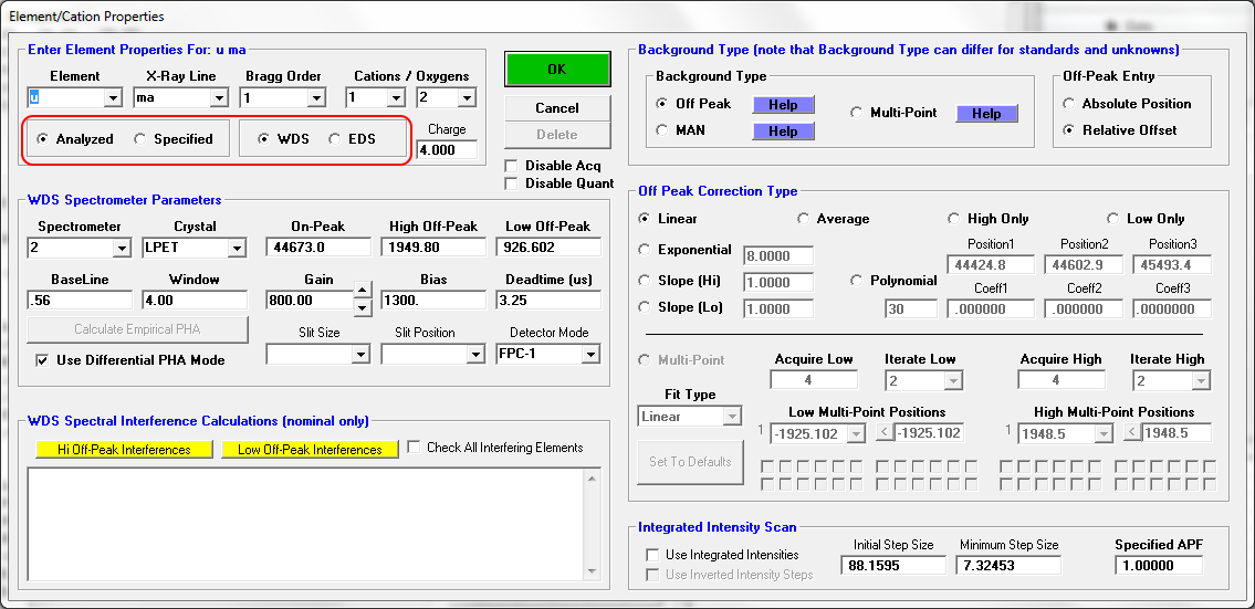 Note that the WDS and EDS elements (and unanalyzed elements by specification) are specified in the same window now.  This means that one can perform interference corrections between WDS by WDS, WDS by EDS, EDS by EDS and EDS by WDS.