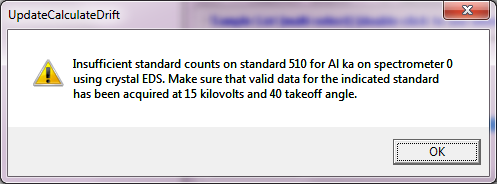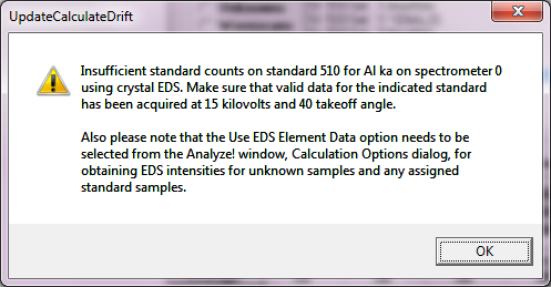 So we realized that we needed to make that warning about the missing standard intensities more explicit, if the missing standard intensity is an EDS element. So now the error dialog (as soon we upload the next version) will show this message: