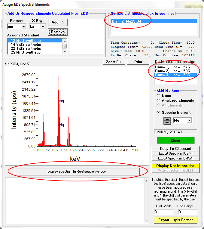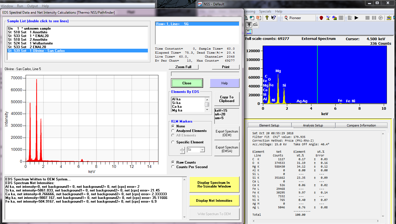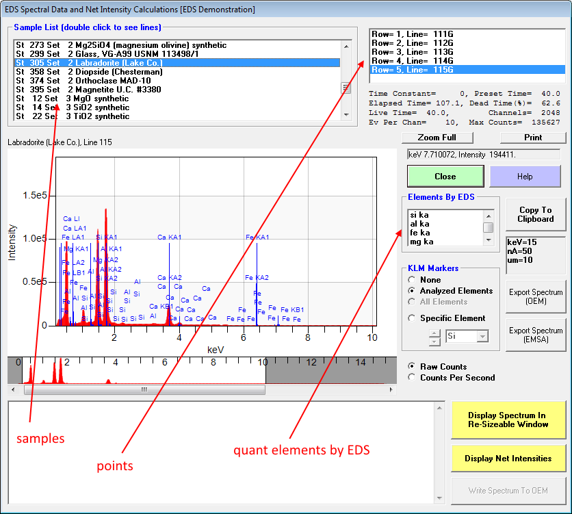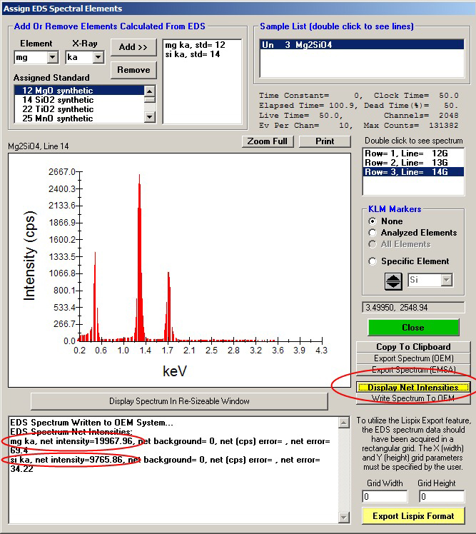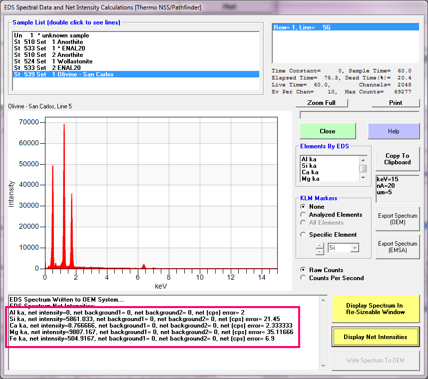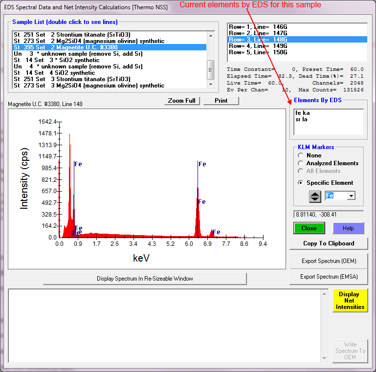 If our colleague had been acquiring both EDS and WDS elements, the actual problem would have been more obvious as you will see. The other clue was that we could see the net intensities properly displayed in the EDS spectra display dialog in Probe for EPMA (from the Run menu) as seen here: