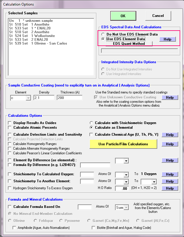It turns out that Probe for EPMA is very flexible, one can acquire EDS spectra with WDS elements, or just WDS elements, or just EDS spectra elements, but if you want to include them in your quant calculations, one needs to "turn them on" using the Calculation Options dialog from the Analyze! window as seen here: