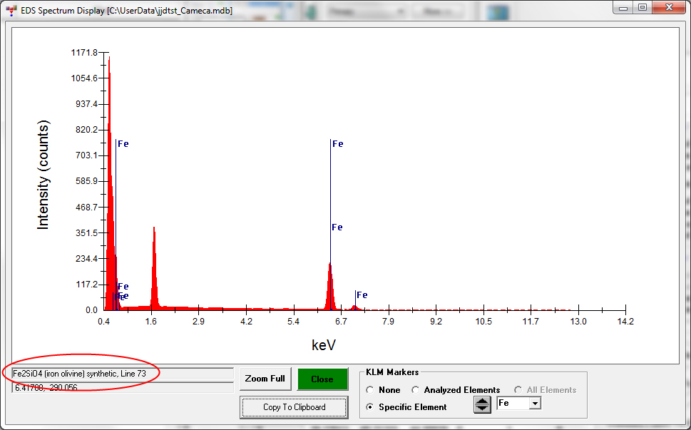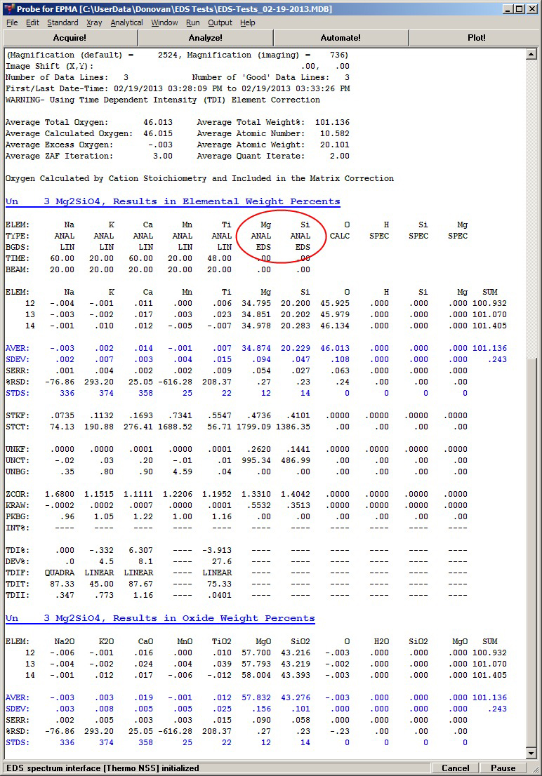 Note that the olivine standard was assigned for Fe and Mg, and the Si (and other elements) were analyzed using a secondary standard. This is the best thing about performing EDS analyses in Probe for EPMA- one *must* utilize actual, honest, got to love 'em, standards!   ;D