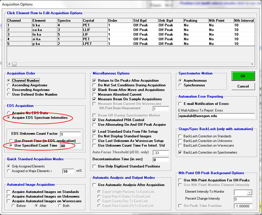 After specifying the elements by WDS acquisition, we go to the Acquisition Options button in the Acquire! window and select the Acquire EDS Spectrum Intensities option, followed by specifying the EDS acquisition time which can be the default in NSS or Esprit or user specified as shown here: