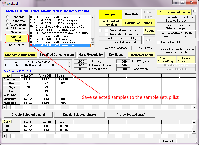 In fact you can make multiple sample setups in Probe for EPMA by clicking the Add To Setups button in the Analyze! window,