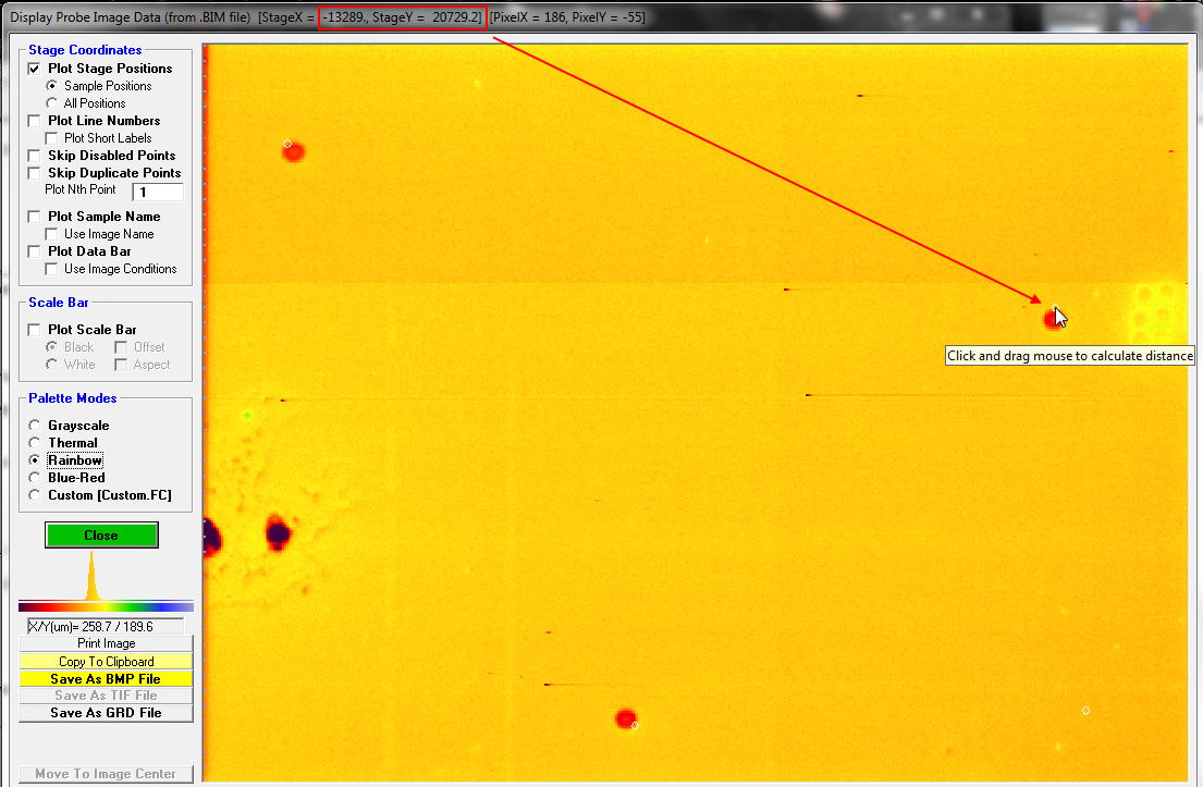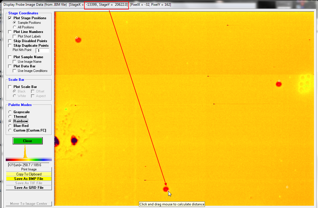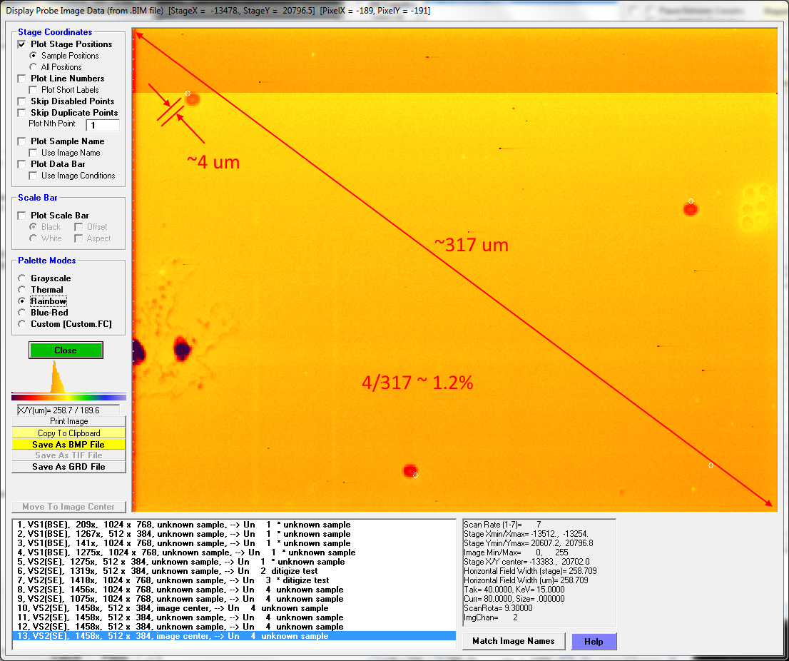 But first let's calculate the relative accuracy of these displayed positions relative to the beam burn positions on the above image.  Using the click and drag feature in the Display, Annotate and Export Analog Signal Image dialog, I found that the image diagonal length is ~317 um and for the upper left analysis point, the distance between the beam burn and the displayed circle is about 4 um, which is an error of about 1.2% relative, or about 2.4% relative based on just the radius.  Since Cameca instruments have a specified accuracy of 3% relative for magnification, that doesn't seem all that awful, but perhaps we can do better.