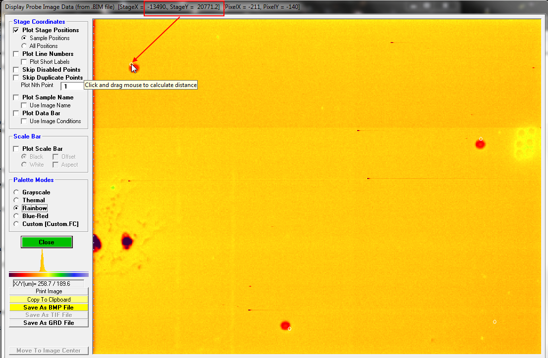 Starting with the first analysis position (point 4), we have a recorded stage coordinate of -13490 for x and 20771 for y. Here is the mouse cursor captured while sitting on the displayed analysis position for point 4: