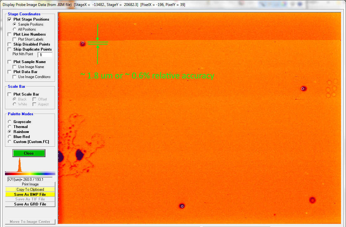 When I load a low mag image (~150x) into PictureSnap and double click on various features, the stage drives to within 5 to 8 um or so, which considering the 2600 um width of the image, that amounts to roughly 1/2% accuracy. That I think is about as good as we're going to get given the hysteresis and non-linear lens effects in EPMA instruments.