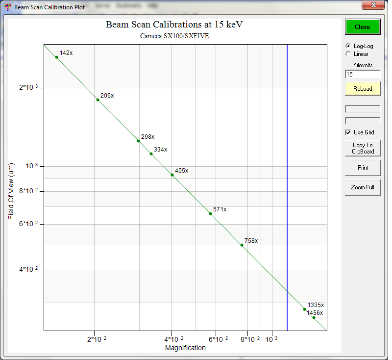 Additional comments. If a given instrument has an accurate magnification calibration, then the FOV - mag data should be applicable to all instruments that have the same geometry; that is, it seems to me that any Jeol microprobe using the largest aperture at 15 kV, should be able to use the FOV values calculated by these fits I have shown. There really is no need for extensive and repeated calibration unless there are alignment problems and different apertures are being used, etc.