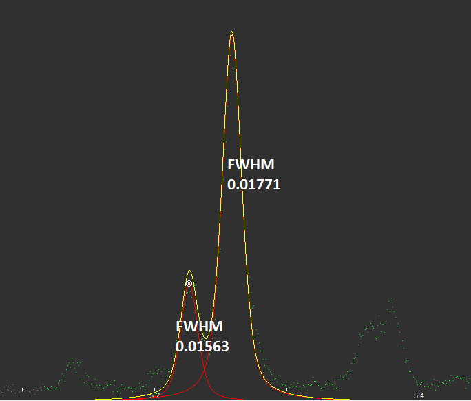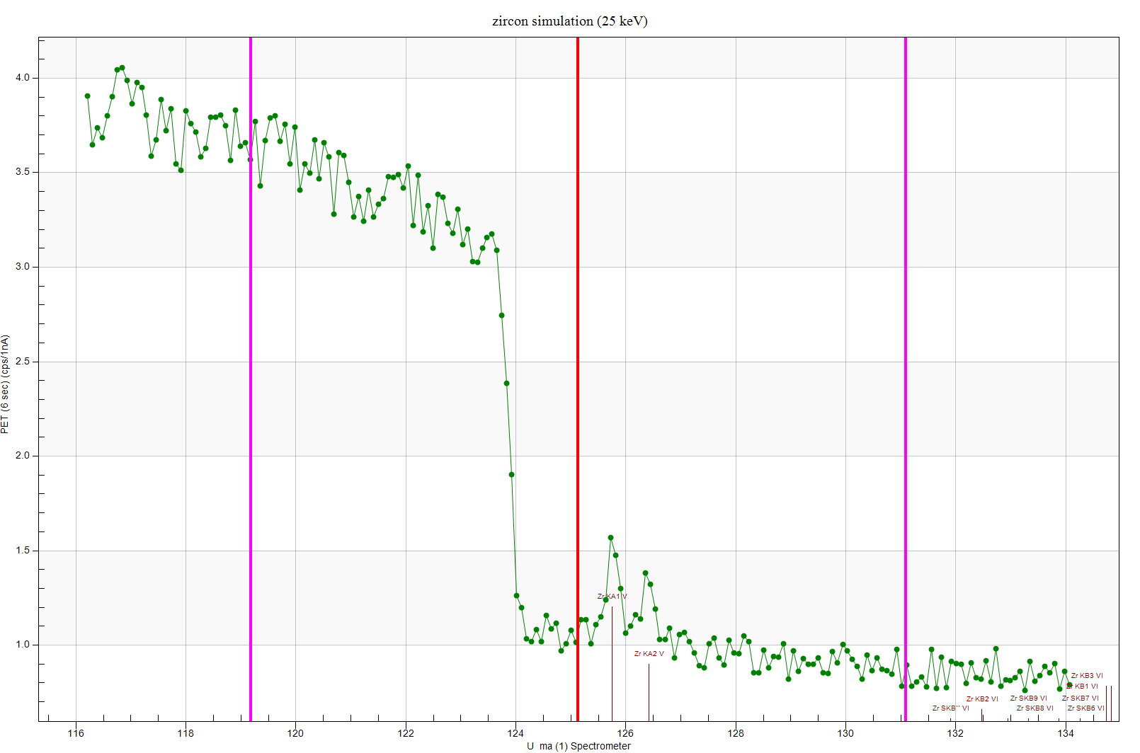 I worked a bit on the higher order Bragg reflection code and here is a simulated scan of U ma ROI on PET for a zircon composition (at 25 keV):