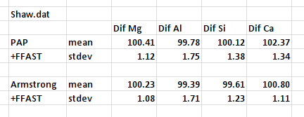 To be honest, I'm not sure why Ben was looking at the Shaw data set, but I don't think he was looking at alpha factors as he only mentioned the PAP and Armstrong phi/rho/z methods in his previous posts.  In any event, I figure it's good to get the Shaw dataset into CalcZAF with the proper samples names and published compositions.   If only for purposes of historical documentation!
