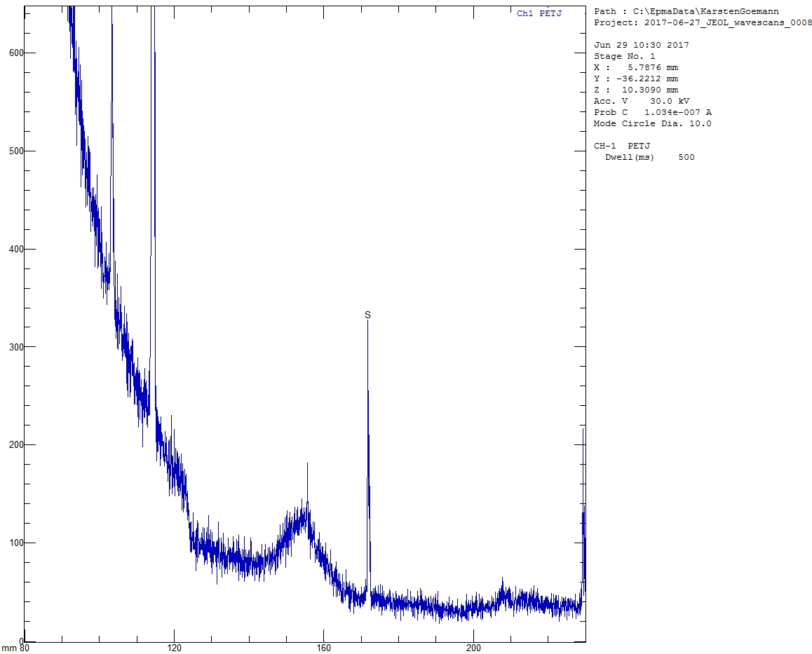But on the Cameca the WDS are separated from the chamber with only the small "separation window" for the x-rays to pass through, so I don't see how your artefact can be the same thing. I assume your scans are from a high pressure P10 counter, so it's not very likely any BSEs make it through that thick separation window? I don't think it is the same thing as it appears related to the sample material which ours isn't.