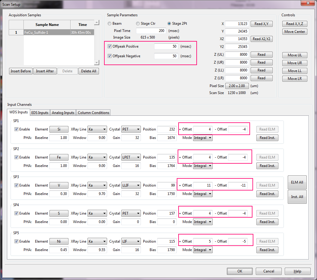 This is an example from a JEOL instrument, but the cool thing is that the software automatically acquires the off-peak maps specified (based on the off-peak positions from Probe for EPMA) after the on-peak acquisition. Of course most people nowadays just acquire on-peak maps and utilize our MAN correction which gives better sensitivity and in roughly half the acquisition time: