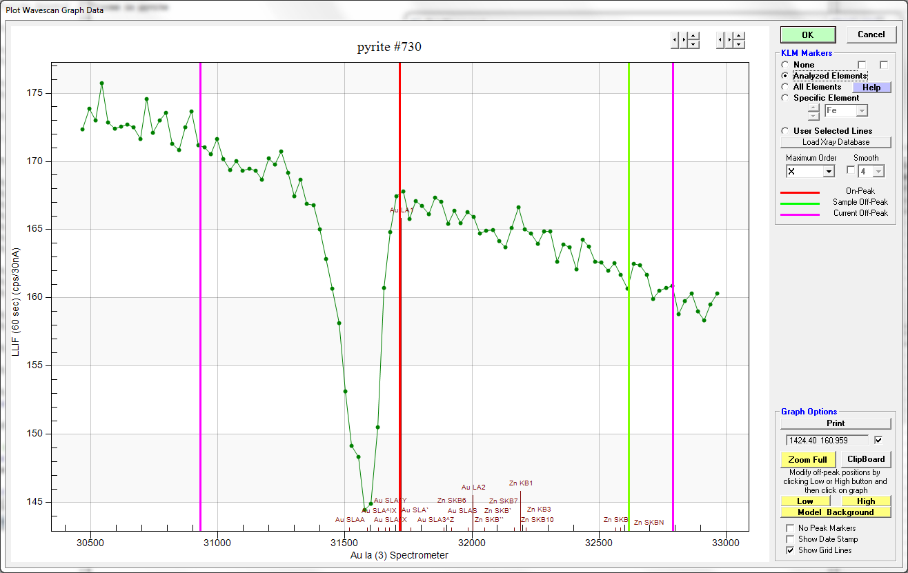 That is the thing about the MAN background calibration. Sometimes it tells you about trace contaminants in your standards, sometimes it tells you about subtle spectral interferences in your sample!  All useful stuff to know about. So then the class looked at our scan data for Au Ma on pyrite and noticed this: