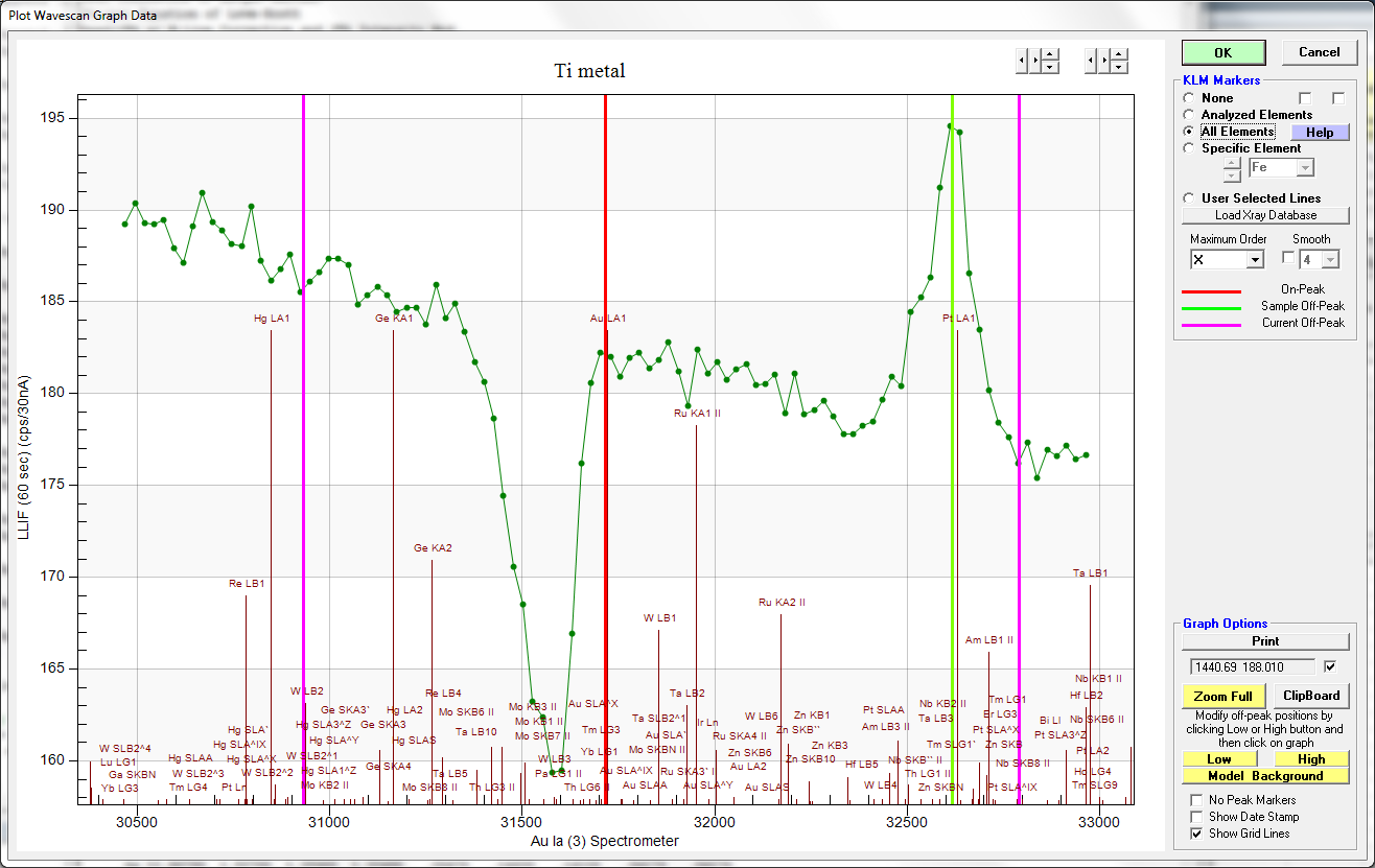 So what gets interesting is this: what is that other peak in the scan on Ti metal?  If I plot all the element KLM markers I get this plot: