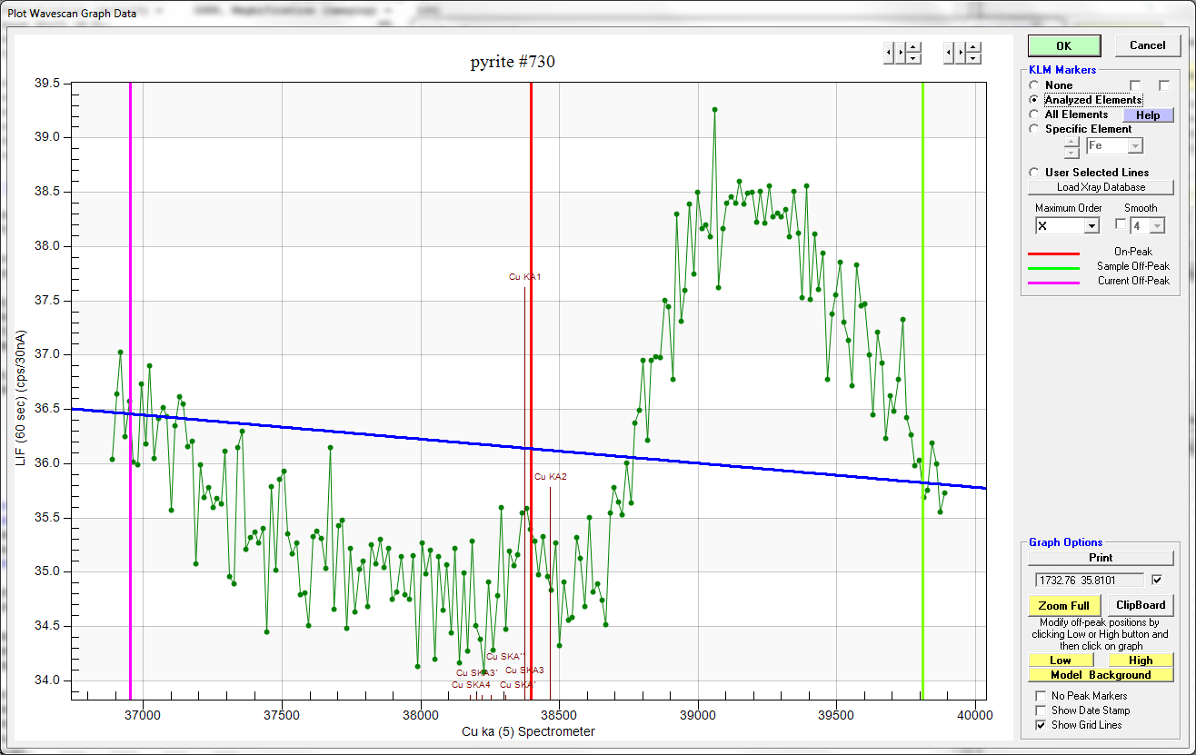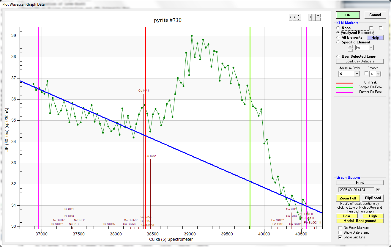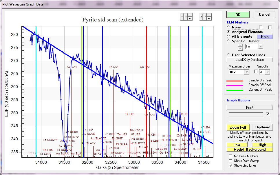 At least for their background positions. This is a scan of Ga Ka in FeS2, showing the multi-point background measurement positions (in light blue and dark blue- light blue being the MPB positions that are available for adjustment).