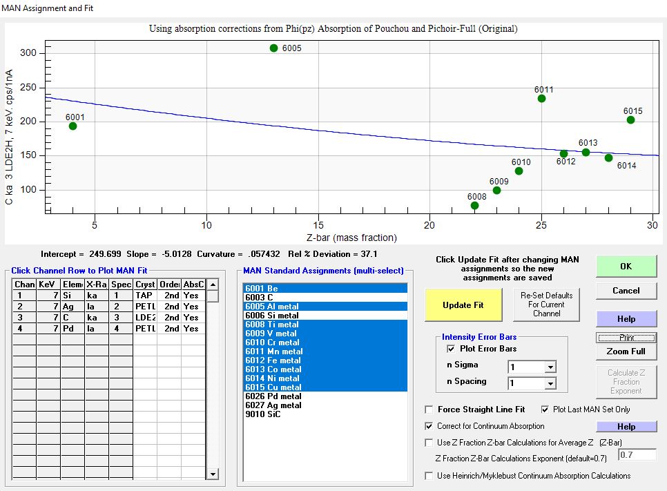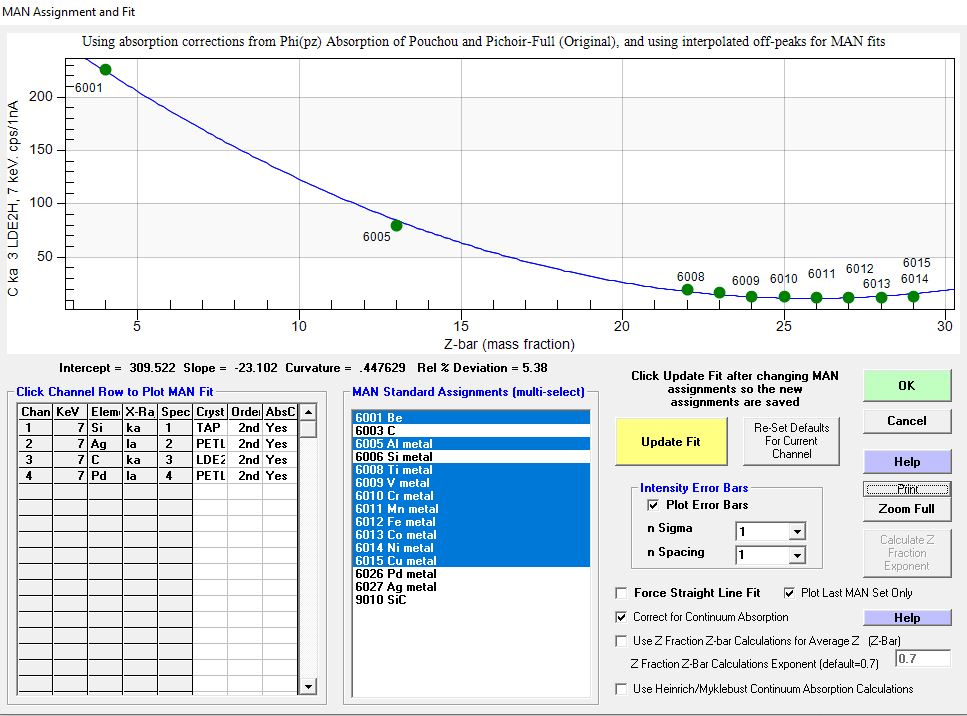 I'd like to try using the interpolated background calculated using the multipoint off peaks, so I enable the "Use Interpolated Off Peaks for MAN Fit" in the Analysis Calculations Options window and go back to the "Assign Man Fits" window, but when selecting carbon I get "WARNING - No MAN count data (all marked as missing) was found to calculate the MAN background fit on C ka on spectrometer 3 on crystal LDE2H at 7 keV."